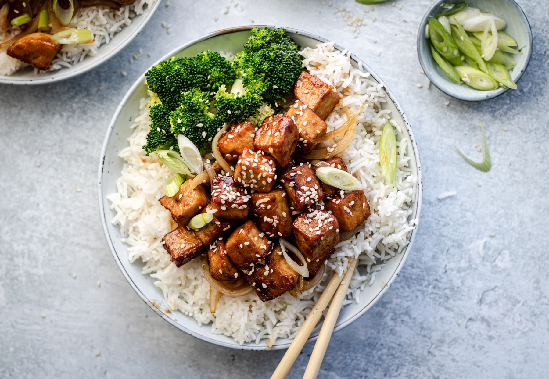 One of my absolute staples is a tofu teriyaki bowl. I probably make this once a week without even thinking about it because it’s just that good and easy.